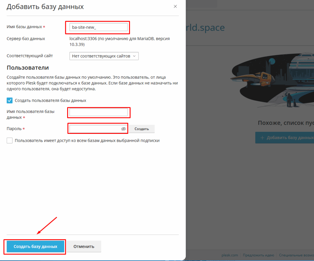 Создание базы данных в панели Plesk выполняется всего в несколько шагов. Ниже приведена подробная инструкция.